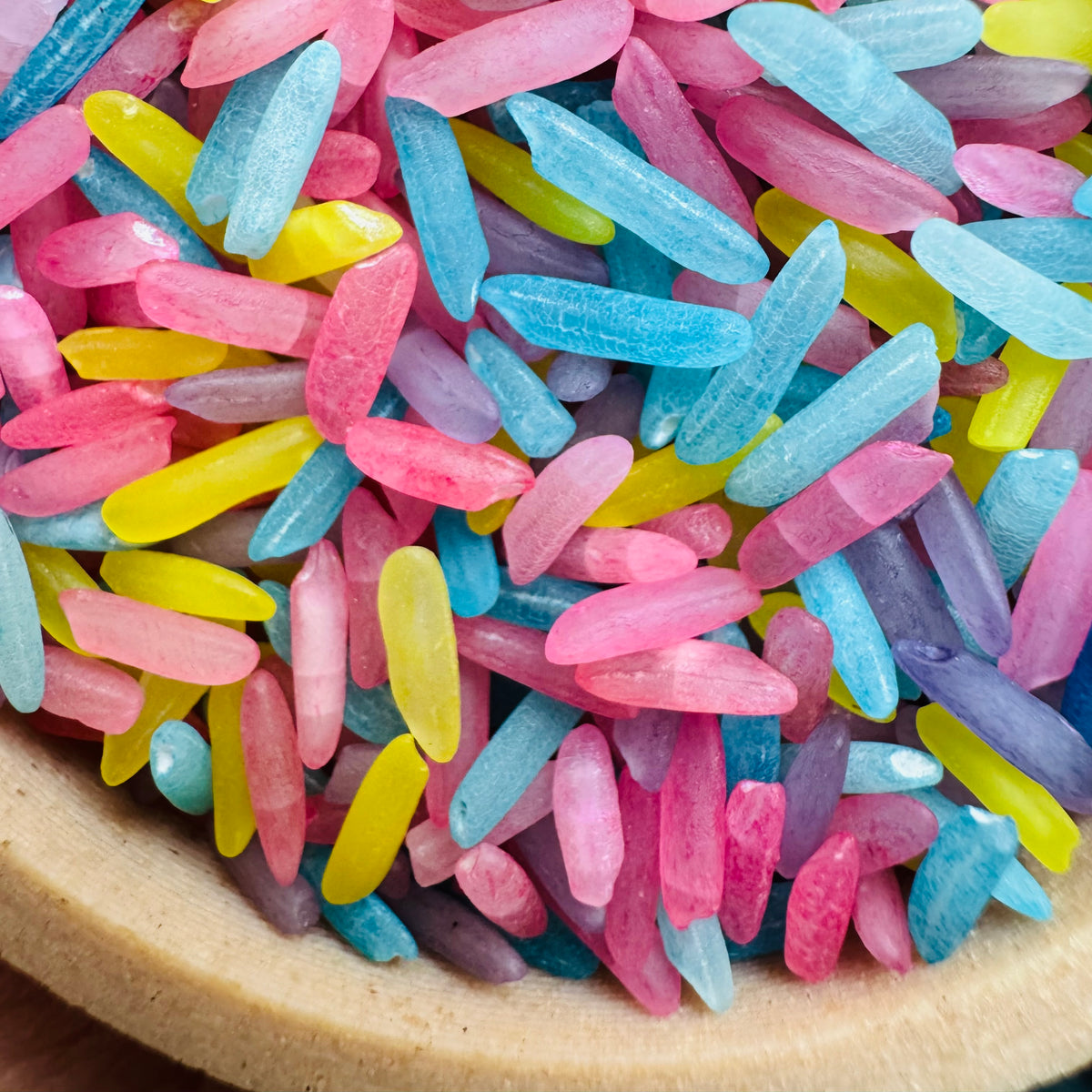 Entdecken Sie die Magie unseres bunten Spielreises! Perfekt für sensorisches Spielen: beruhigend und anregend für die Sinne. Kinder lieben das weiche Gefühl von Reis in ihren Händen, ideal zum Entspannen vor dem Schlafengehen.