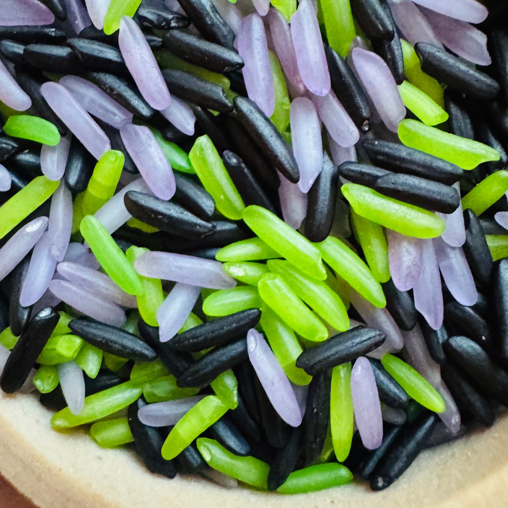 Der Spielreis wird mit Lebensmittelfarbe eingefärbt. 100 % sicher. Es kann also nicht schaden, einen Bissen zu nehmen.