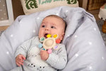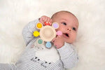 Een tactiele en sensorische rammelende bijtring, met verschillende kleuren knallende knoppen en sensorische tandjes aan de buitenkant. Er is een zacht gerammel in de centrale bubbel.
