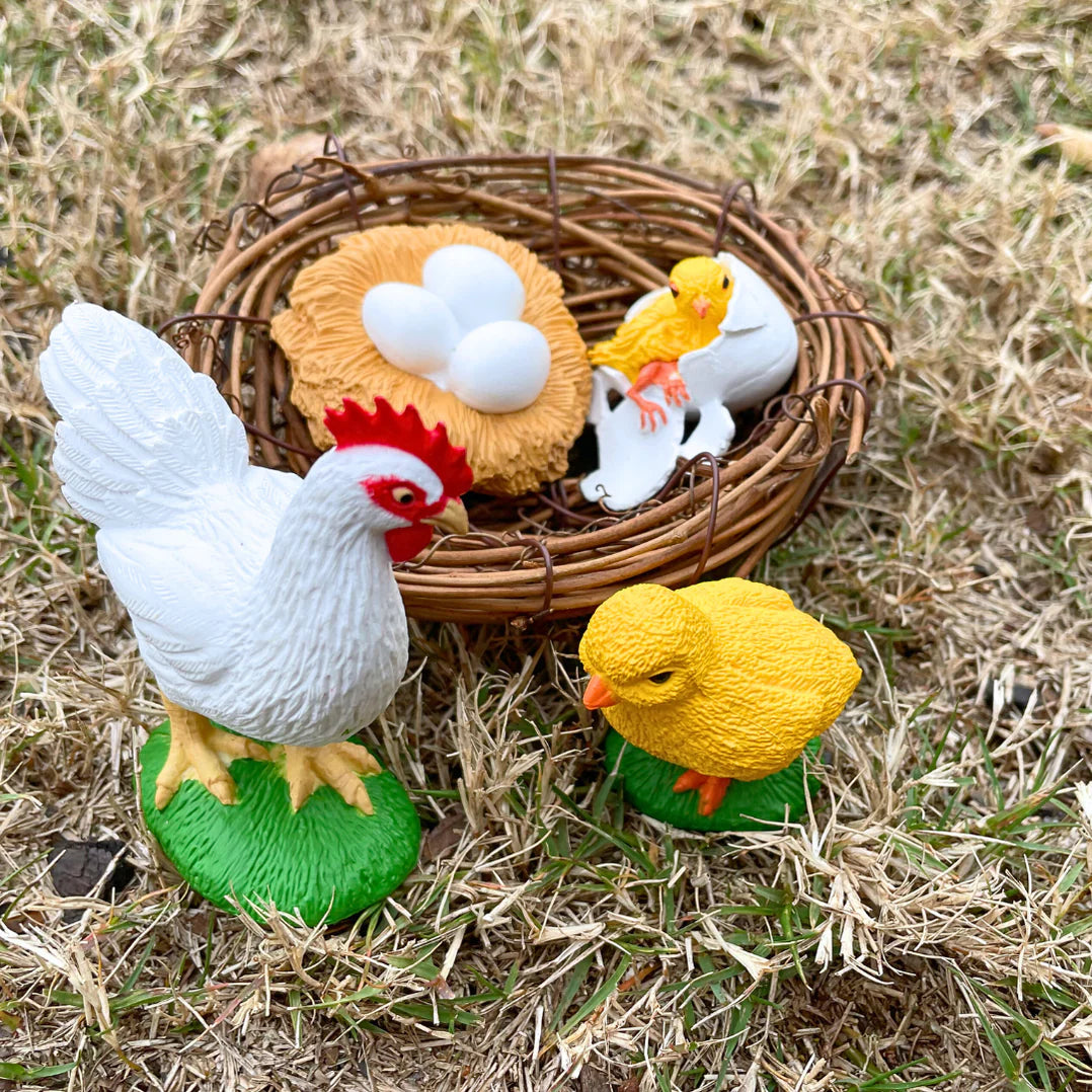 Vierteiliger Lebenszyklus des Huhns. Doch wer war zuerst da? Das Huhn oder das Ei? Die Figuren in diesem Set sind perfekte Montessori-Spielzeuge für den Unterricht über biologische Prozesse und Lebenszyklen von Tieren.