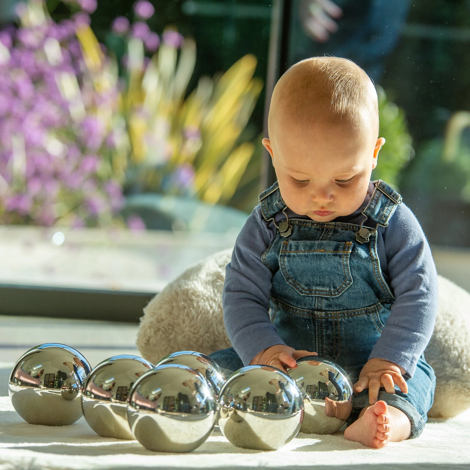 Von diesem Set aus 6 glänzenden Bällen hat jeder seine eigene geheimnisvolle Eigenschaft: Einige wackeln oder rollen auf unerwartete Weise, andere drehen sich seltsam oder machen lustige Rasselgeräusche, wenn man sie schüttelt. Die verspiegelten, reflektierenden Oberflächen erzeugen eine lustige, verzerrte Realität, als ob Sie durch eine Weitwinkellinse schauen würden.