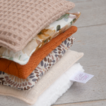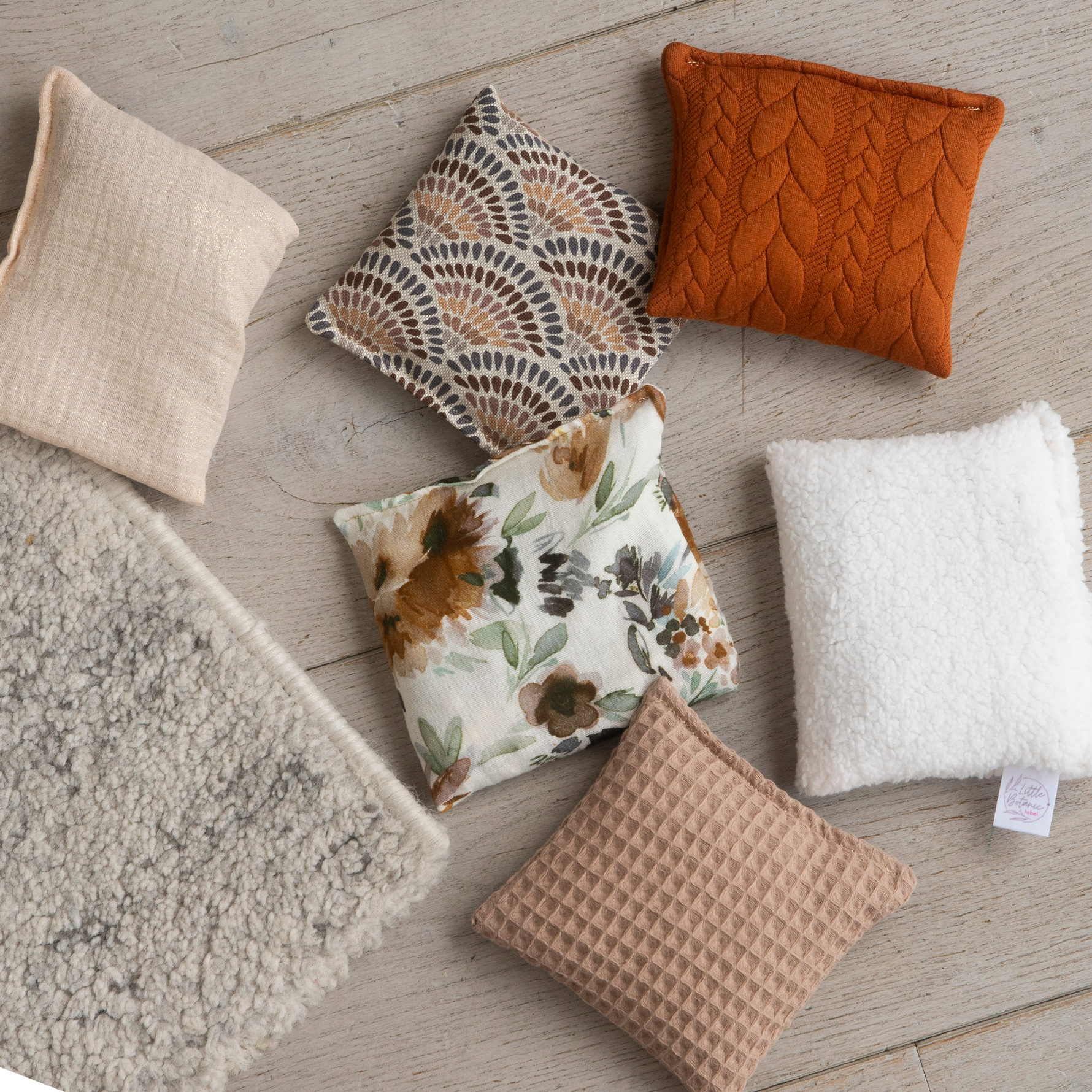 Omdat er al genoeg plastic op deze wereld is, vul ik mijn pittenzakjes met natuurlijke materialen, namelijk kersen-, druivenpitten en een mix daarvan. Voor de stoffen heb ik gekozen voor verschillende texturen en rustige botanische prints in aardetinten. Alle stoffen zijn voorzien van een OEKO-TEX keurmerk.
