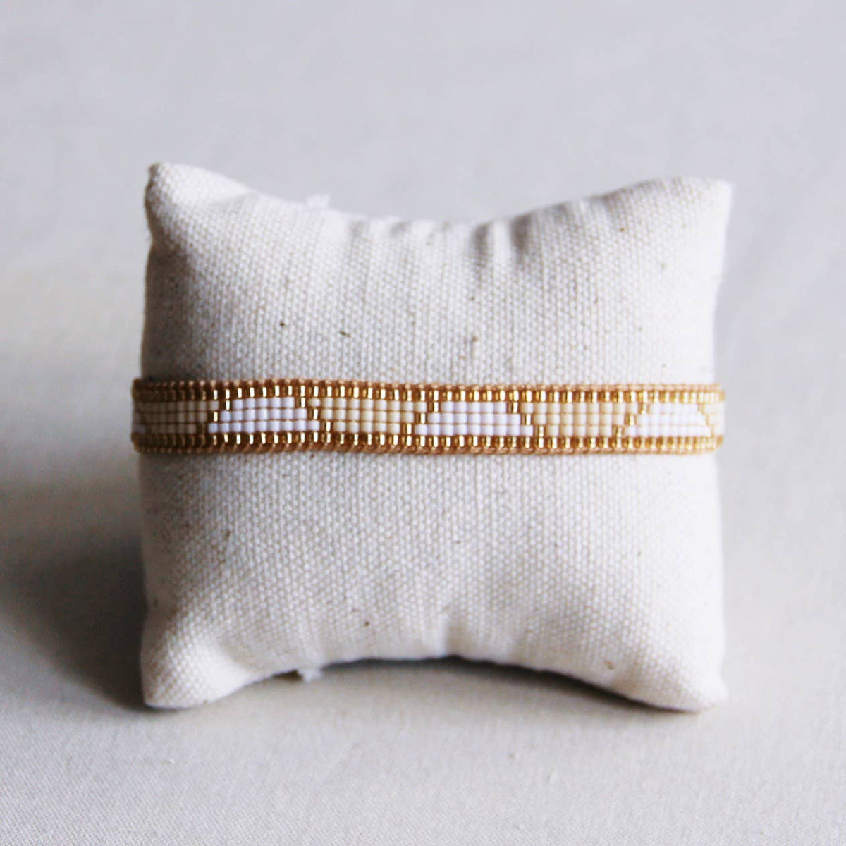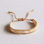 Deze kralen geweven armband in de kleur wit/champagne gecombineerd met goud heeft een schuifknoop en is daarom verstelbaar. Materiaal: miyuki